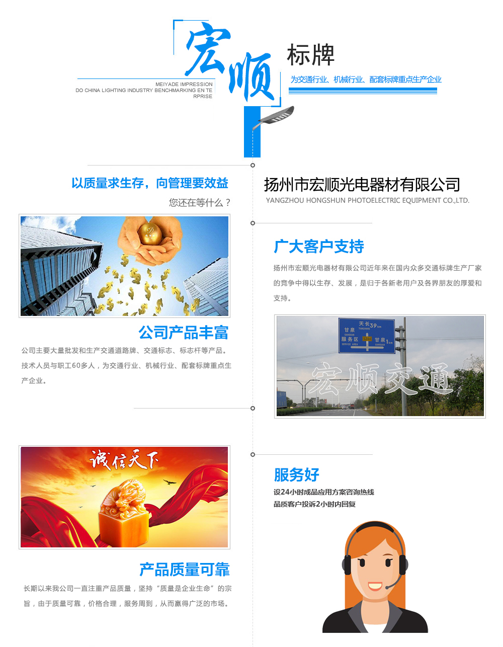 揚(yáng)州市宏順光電器材有限公司近年來(lái)在國(guó)內(nèi)眾多交通標(biāo)牌生產(chǎn)廠家的競(jìng)爭(zhēng)中得以生存、發(fā)展,是歸于各新老用戶及各界朋友的厚愛和支持。我們?nèi)w員工向你們致以誠(chéng)摯的感謝。 為使我們共同步入新世紀(jì),提高我們的產(chǎn)品質(zhì)量與服務(wù)希望對(duì)我們提出寶貴的意見,使我們不斷改進(jìn)、創(chuàng)新。 我們將和過去一樣,視今天的質(zhì)量為明天的市場(chǎng)。為您奉獻(xiàn)滿意的各種精品,為美化我們的交通事業(yè)做出貢獻(xiàn)。 公司主要大量批發(fā)和生產(chǎn)道路交通標(biāo)志牌、道路指示牌、交通標(biāo)志牌、指路牌、反光標(biāo)志牌等產(chǎn)品。技術(shù)人員與職工60多人,為交通行業(yè)、機(jī)械行業(yè)、配套標(biāo)牌重點(diǎn)生產(chǎn)企業(yè)。 長(zhǎng)期以來(lái)我公司一直注重產(chǎn)品質(zhì)量,堅(jiān)持“質(zhì)量是企業(yè)生命”的宗旨,由于質(zhì)量可靠,價(jià)格合理,服務(wù)周到,從而贏得廣泛的市場(chǎng),近年來(lái)隨著交通事業(yè)的開發(fā)和研究,傾聽用戶的意見,使得我們?cè)谑袌?chǎng)競(jìng)爭(zhēng)中不斷發(fā)展壯大。 我們本著“質(zhì)量可靠、信譽(yù)優(yōu)先、用戶至上”的宗旨,“以質(zhì)量求生存,向管理要效益”的信條,竭誠(chéng)為... ...【查看更多】